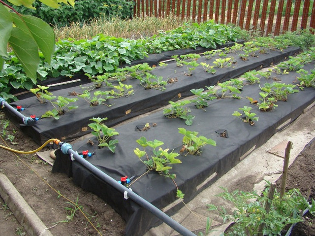После посадки поливаем каждый куст отдельно. После этого поверх агроволокна можно установить капельный полив подключенный к системе подачи воды. Капельное орошение также можно устанавливать заранее, перед укладкой агроволокна. Благодаря такому комплексу агроволокна+орошения затраты времени на уход за грядкой сводятся до минимума. |